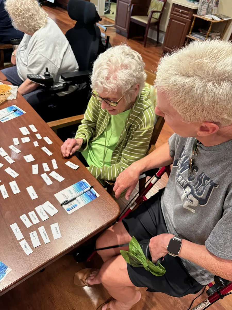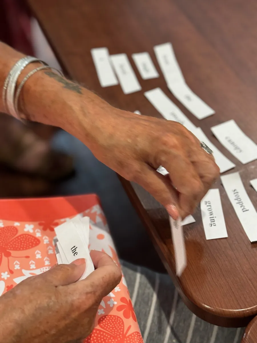 And then there was husband and wife, Gary and Opal, working companionably to create meaning from the pile of words on the table in front of them. He gently encouraged her. She lined up nouns, verbs and adjectives to their mutual liking. It was easy to envision how they worked together over the years to build a home.