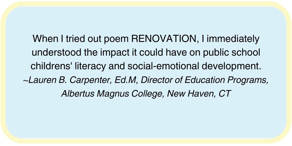 Educators say poem RENOVATION is a fun, approachable way to aid in social-emotional learning, prompt creativity and self expression, strengthen communication skills and confidence, and build community.